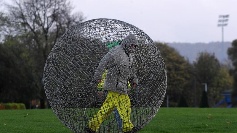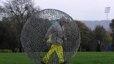 German artist and environmentalist Arnd Drossel who has walked from Germany to Glasgow in athis giant metal ball is eenart at a protest rally during a global day of action on climate change in Glasgow on November 6, 2021, during the COP26 UN Climate Change Conference. ANDY BUCHANAN / AFP