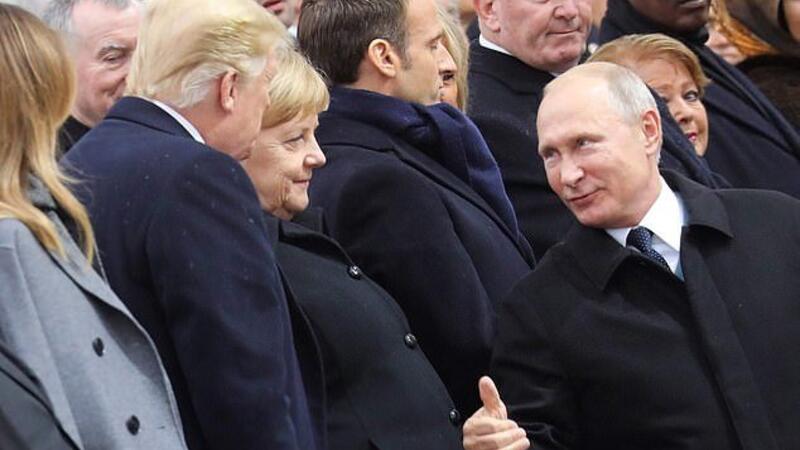 The last to arrive was Russia's Putin, who shook hands with Macron, Merkel and then Trump, briefly giving the U.S. leader a thumbs up.