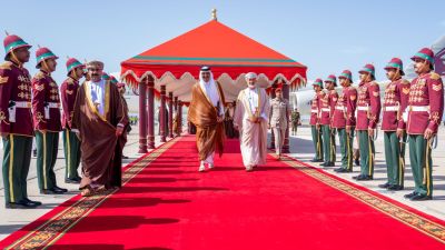 Haitham bin Tariq receives Tamim bin Hamad Al Thani upon his arrival in Oman on Thursday, April 16, 2026. Photo credit: @RoyalOmanFamily