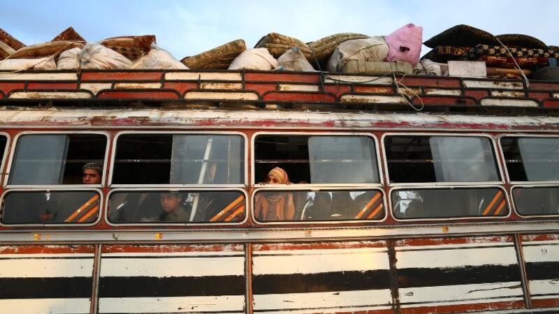 Buses carrying Jaish al-Islam fighters and their families from their former rebel bastion of Douma, arrive at the Abu al-Zindeen checkpoint controlled by Turkish-backed rebel fighters near the northern Syrian town of al-Bab, on Apr. 12, 2018. Rebels in Syria's Eastern Ghouta surrendered their heavy weapons and their leader left the enclave, a monitor said, signalling the end of one of the bloodiest assaults of Syria's seven-year war. (Nazeer al-Khatib / AFP)