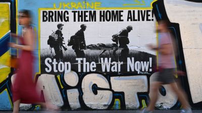 Pedestrians past an anti-war poster on a wall in the centre of Kiev, on July 2, 2022, amid Russia's military invasion launched on Ukraine. (Photo by Miguel MEDINA / AFP)