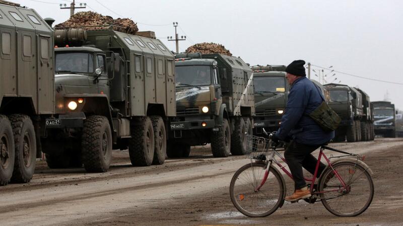 Russian army military vehicles are seen in Armyansk, Crimea, on February 25, 2022. (Photo by STRINGER / AFP)