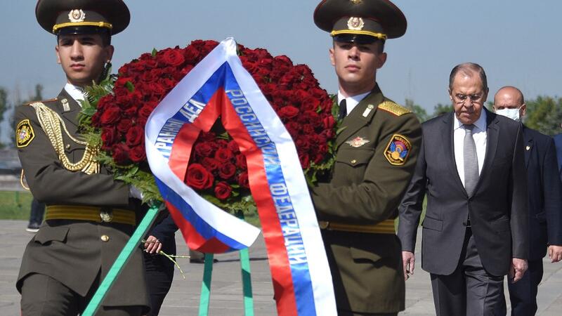 Russian Foreign Minister Sergei Lavrov walks behind guards carrying a wreath during a ceremony at the Armenian Genocide Memorial in Yerevan on May 6, 2021. Karen MINASYAN / AFP