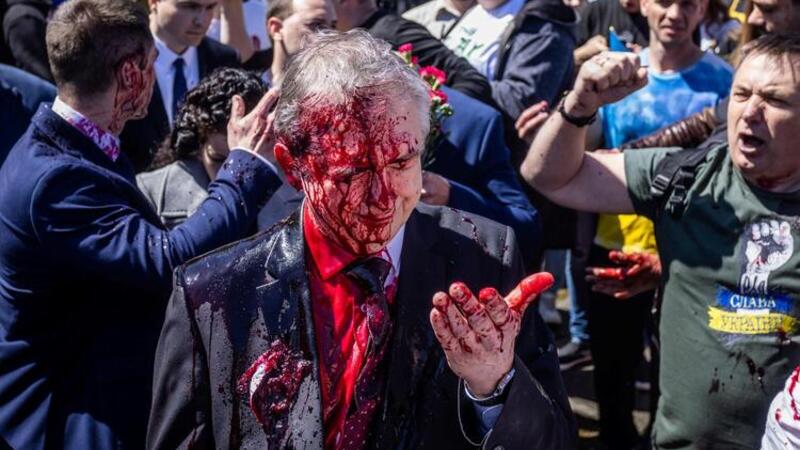 As the Russian ambassador attempted to enter and lay flowers at the cemetery protesters chanted "fascist" and "murderer" at him, then threw a red paint-like substance at him that made it appear as if he was covered in blood.