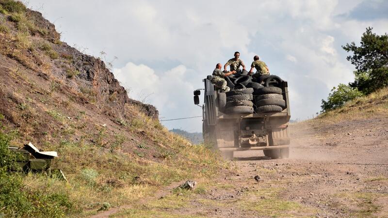 Armenian servicemen transport used tyres in the back of a truck to fortify their positions on the Armenian-Azerbaijani border near the village of Movses on July 15, 2020. Defence officials in Armenia and Azerbaijan said fighting on their border subsided on July 15, 2020 after several days of deadly clashes raised fears of a major flare-up. At least 16 people on both sides were killed in three days of shelling that started Sunday between the ex-Soviet republics, which have been locked for decades in a confli