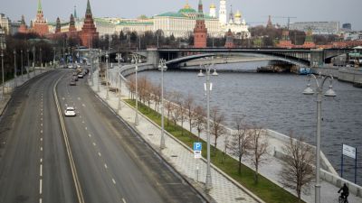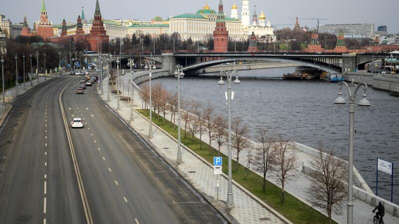 A bicyclist rides on the empty embankment close to the Kremlin in central Moscow on April 3, 2020, amid the spread of the COVID-19, the novel coronavirus. Kirill KUDRYAVTSEV / AFP