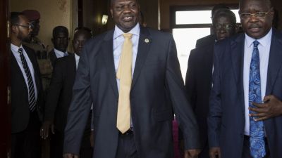 South Sudan's exiled rebel leader Riek Machar (L) arrives for a meeting with his rival, President Salva Kiir (not pictured) in Juba, South Sudan (AFP)