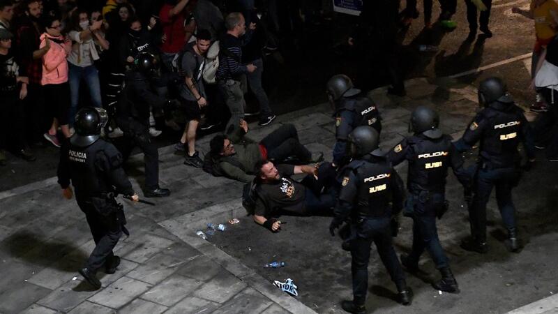 At least 37 protesters were injured Monday in clashes with police at Barcelona’s airport after Spain’s Supreme Court sentenced nine separatists to prison for illegally promoting Catalan independence, according to local authorities.