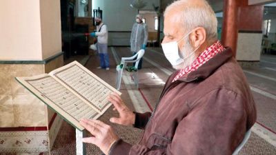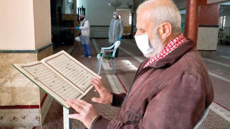 An elderly man wearing a face mask reads from the Holy Koran while seated in a mosque being sterilised by Palestinian health workers in the West Bank city of Ramallah due to fears of coronavirus spread (AFP file photo)