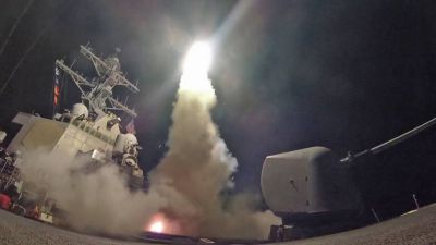 The guided-missile destroyer USS Porter conducts a strike against a Syrian airfield from the Mediterranean Sea on Friday. | AFP
