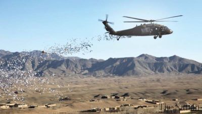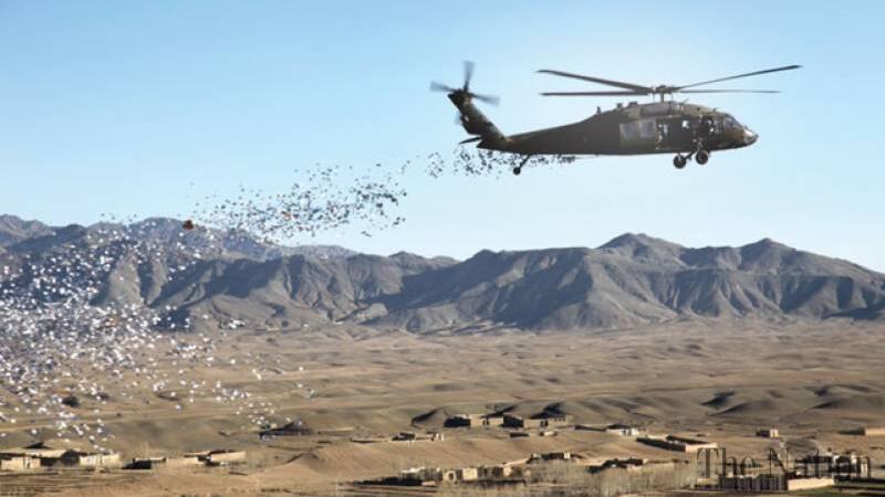 The leaflets, bearing the title "Choose your destiny" and a photo of a dead Syrian, were dropped from a helicopter onto Idlib's Sarmada, Ram Hamdan villages and a refugee camp in Kemmune village.