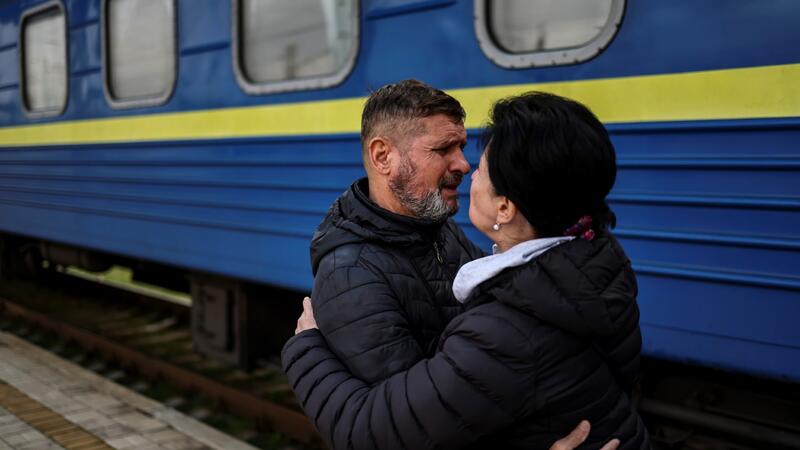 A man embraces his wife as she is about to board a train at Sloviansk central station, in the Donbass region on April 12, 2022, amid Russian invasion of Ukraine.RONALDO SCHEMIDT / AFP)