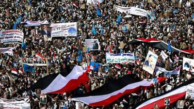 The mass demonstration marks the second anniversary of the start of the Saudi coalition's campaign, which began in March 2015.