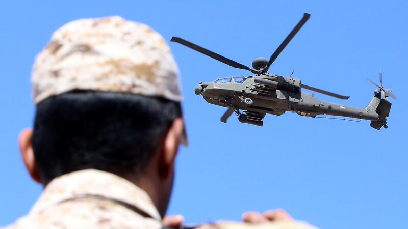 A Kuwaiti Apache helicoptertakes part in a military exercise at the Udaira military range, some 140km north of Kuwait City, on November 18, 2021, as part of the 'Gulf Shooting 2021' exercise with the participation of the Royal Saudi Land Forces, the Kuwaiti Land Forces and the US Army's Spartan Force. (Photo by YASSER AL-ZAYYAT / AFP)