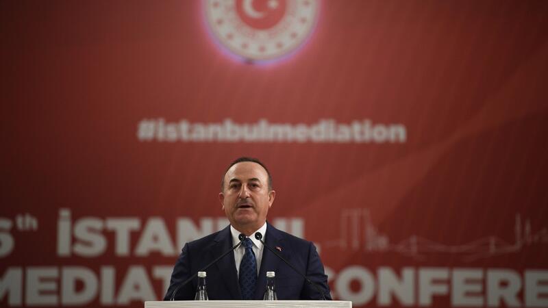 Turkish Foreign Minister Mevlut Cavusoglu speaks as the U.N. Secretary General listens on during the Third OIC Member States Conference on Mediation in Istanbul, on October 31, 2019. BULENT KILIC / AFP