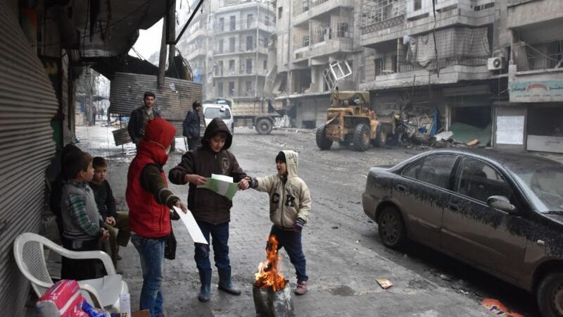 Syrian children gather around a fire as the Syrian government starts to clean up areas formerly held by opposition forces in Aleppo on December 27, 2016, in the Shaar district. (AFP/George Ourfalian)