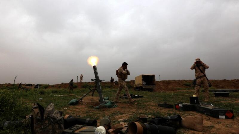 Iraqi soldiers fire artillery as they hold a position on the outskirts of Makhmur, about 175 miles north of Baghdad, on March 26, 2016, during a military operation to recapture Mosul from Daesh. (AFP/Safin Hamed)