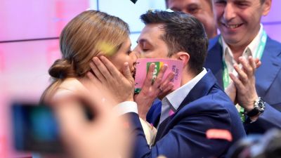 Ukrainian comedian and presidential candidate Volodymyr Zelensky kisses his wife Olena after the announcement of the first exit poll results in the second round of Ukraine's presidential election at his campaign headquarters in Kiev on April 21, 2019.  Sergei GAPON / AFP