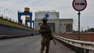 This photo taken on May 20, 2022 shows a Russian serviceman standing guard near the Kakhovka Hydroelectric Power Plant, Kherson Oblast, amid the ongoing Russian military action in Ukraine. (Photo by Olga MALTSEVA / AFP)