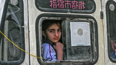 A girl looks from out the window of a vehicle leaving the town of Sarmin in Syria's northwestern Idib province, headed towards the border with Turkey, on March 10, 2020. Ozan KOSE / AFP