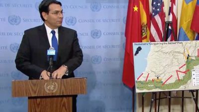 Israel's UN ambassador Danny Danon presented the Security Council with aerial photos that he said proved Hezbollah's presence below the Blue Line.
