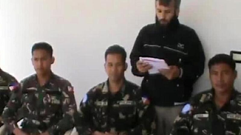 An image grab taken from a video uploaded on YouTube on May 08, 2013 reportedly shows a man reading a statement at an undisclosed location in Syria, behind four abducted Filipino UN peacekeepers. (AFP/ YouTube)