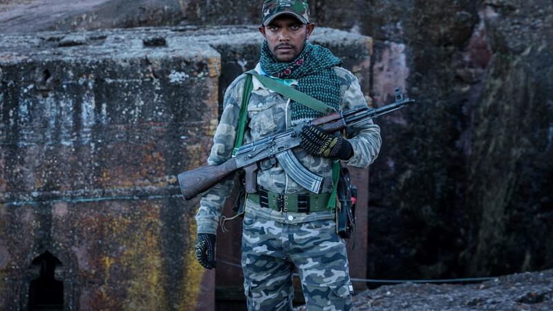Amhara Fano militia fighter Eshete Zewudru poses at Saint George Church in Lalibela, on December 7, 2021. (Photo by Solan Kolli / AFP)