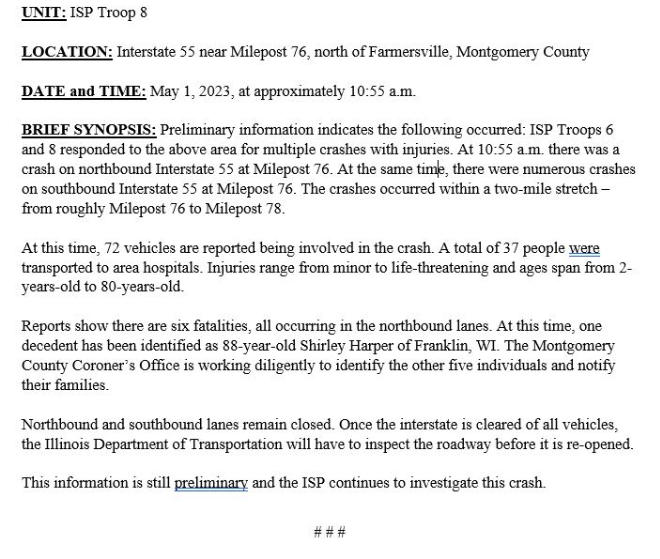 Illinois State Police (ISP) said in a press release that the cause of the crash "is due to excessive winds blowing dirt from farm fields across the highway leading to zero visibility."