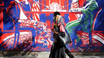 A couple, wearing protective masks amid the COVID-19 pandemic, walks past a mural painted on the outer walls of the former US embassy in the Iranian capital Tehran on September 20, 2020. Iran called on the rest of the world to unite against the United States, after Washington unilaterally declared UN sanctions against the Islamic republic were back in force. Washington has said it will "impose consequences" on any country not complying with the sanctions, although the US is one of the only nations that beli