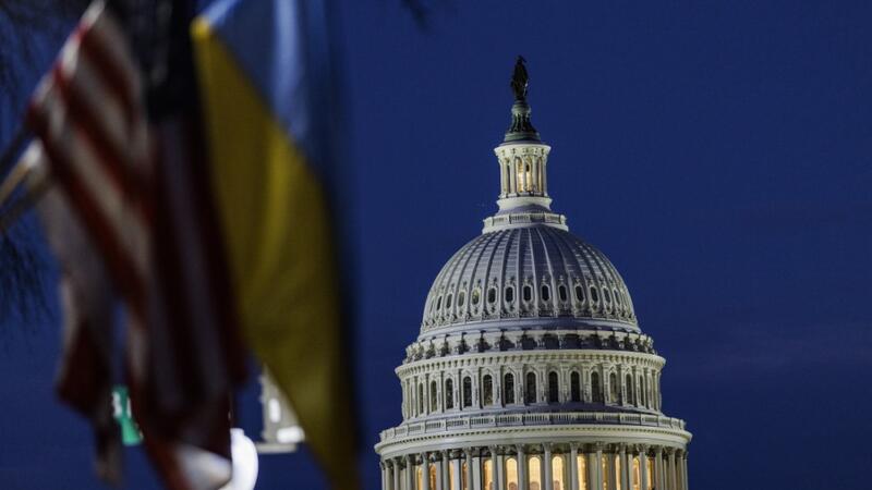 The U.S. Capitol building can be seen past American and Ukrainian flags that were hung on the light posts lining Pennsylvania Avenue ahead of U.S. President Joe Biden's first State of the Union address to a joint session of Congress on March 1, 2022 in Washington, DC. Samuel Corum/Getty Images/AFP