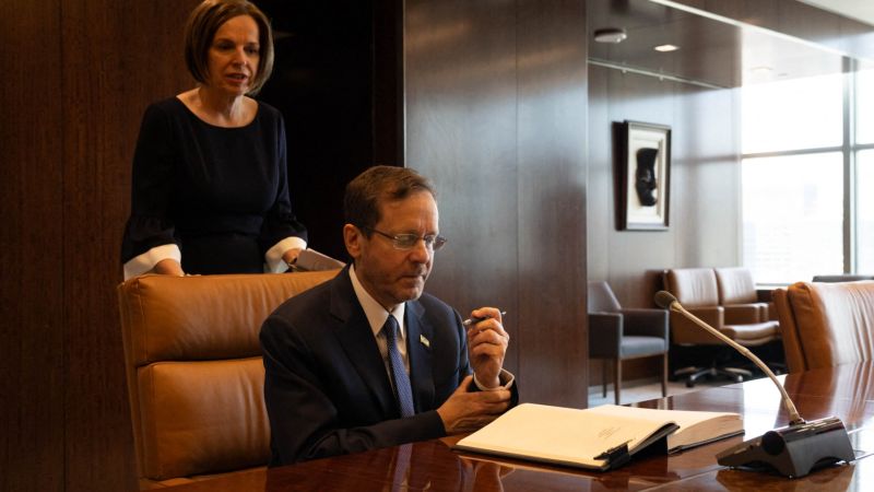 Israeli President Isaac Herzog signs a book during a meeting with UN Secretary-General Antonio Guterres(YUKI IWAMURA/AFP)