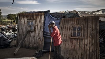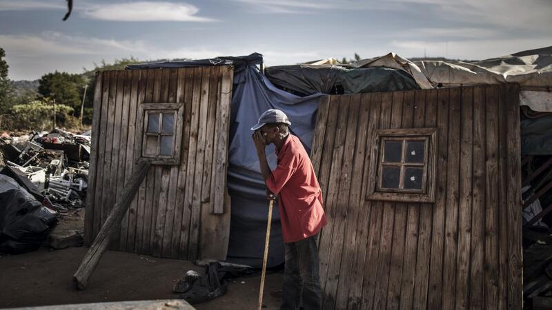 A resident of Plot 323 in Wilgespruit, Johannesburg, pauses on May 08, 2020 in front of a wooden shack during a ministerial visit aimed to ensure that the vulnerable residents of the informal settlement are soon properly accommodated in temporary residential units. MARCO LONGARI / AFP