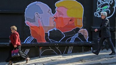 US President Donald Trump and Russian President Vladimir Putin greet each other with a kiss in this mural in the Lithuanian capital Vilnius. (AFP/File)