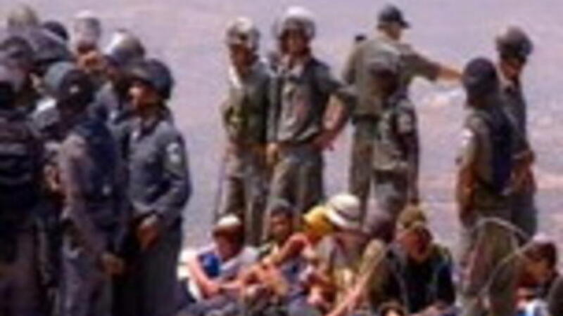 Soldiers wearing riot-gear in were hoisted atop an old British citadel in Sa Nur inside transport containers, attempting to remove the remaining die-hard settlers that had taken hold of the structure.