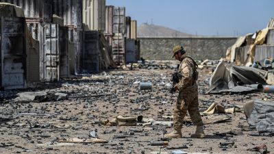 A member of the Taliban Badri 313 military unit walks amid debris of the destroyed Central Intelligence Agency (CIA) base in Deh Sabz district northeast of Kabul on September 6, 2021 after the US pulled all its troops out of the country. (Photo by Aamir QURESHI / AFP)