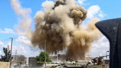 Smoke plume rises on Friday from air strike near tank and trucks belonging to forces loyal to Libya's GNA (AFP)