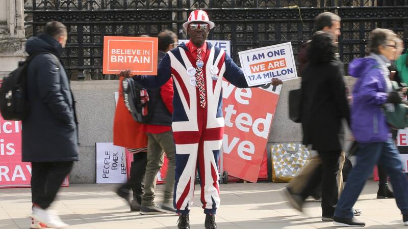 A pro-Brexit campaigner displays placards in Westminster, central London on April 3, 2019. (ISABEL INFANTES / AFP)