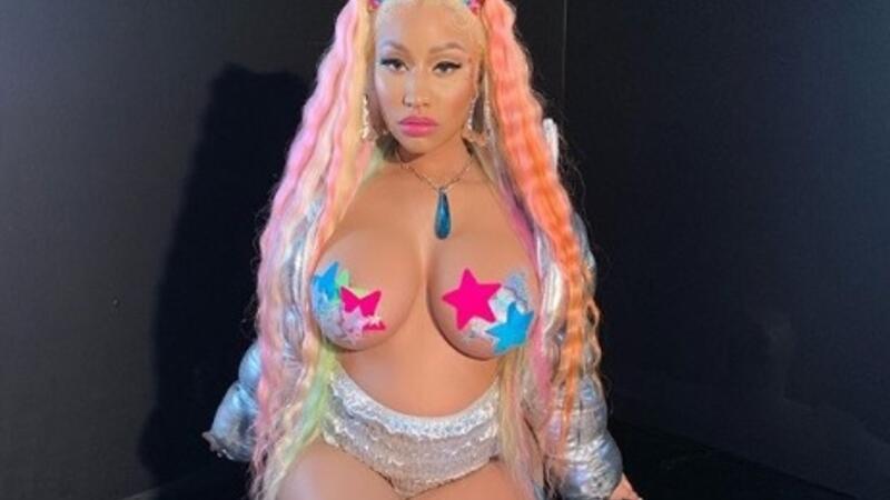 The 37-year-old rapper shared a topless snap of herself rocking colorful pasties on her breasts in order to promote her new Trollzz music video.