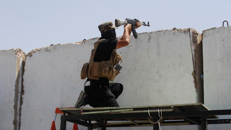 An armed member of Saraya al-Salam (Peace Brigade), the military wing affiliated with Shiite cleric Moqtada al-Sadr, takes aim during clashes with Iraqi security forces in Baghdad's Green Zone on August 30, 2022. (Photo by AHMAD AL-RUBAYE / AFP)