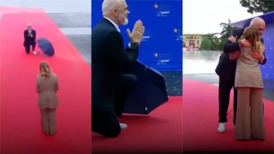 Rama put down his umbrella and knelt down in front of Meloni as she exited her vehicle, his hands joined together in a gesture reminiscent of prayer. Meloni responded with a lighthearted remark after seeing the scenario on video: "You need to stop that, Edi." Later, she joked with reporters, "He only does it to be as tall as me," mocking their obvious height difference—Meloni is 1.63 meters tall, while Rama is over two meters.