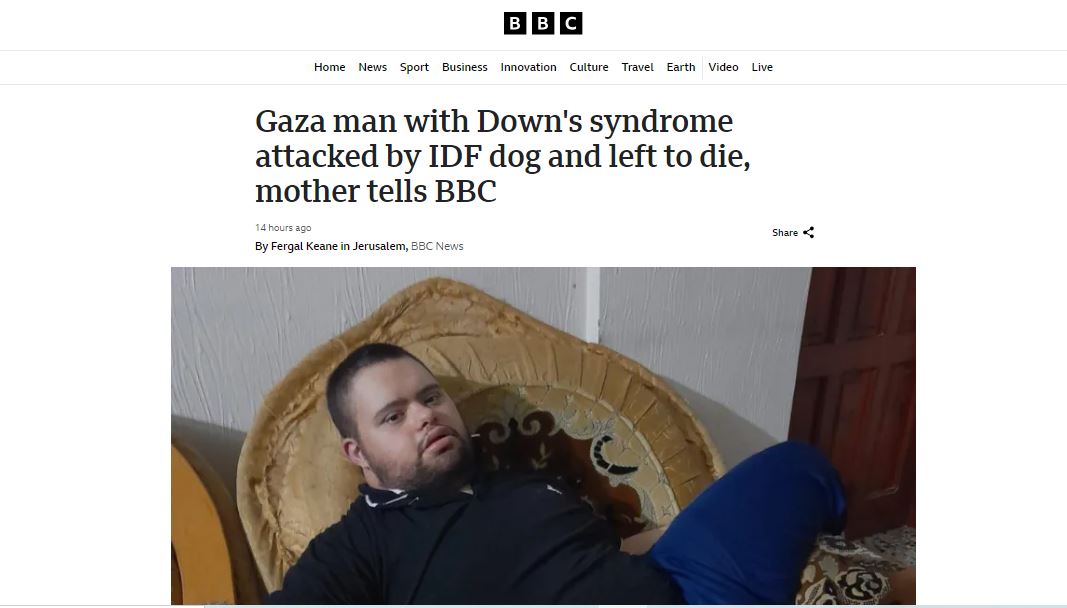 BBC then changed the headline to "Gaza man with Down's syndrome attacked by IDF dog and left to die, mother tells BBC."