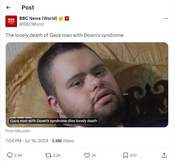 In the first headline, BBC wrote: "Gaza man with Down's syndrome dies lonely death." After posting the article on X (formerly Twitter), the British broadcaster gained huge criticism from pro-Palestinians.