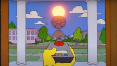In the clip, The Simpsons series showed a huge object controlled by a remote and was used to block out the sunlight on the entire city.