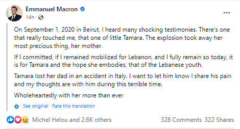 Translation: "The French President Macron shared a message with Tamara the daughter of Tarek Tayah."