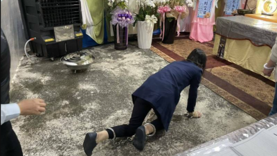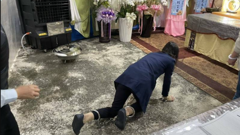 Images shared widely on social media show a shackled Taiwanese official, Chiayi City Councilor Tai Ning (戴寧) kneeling near her father's coffin, caused a public outrage across the country, according to Yahoo News.