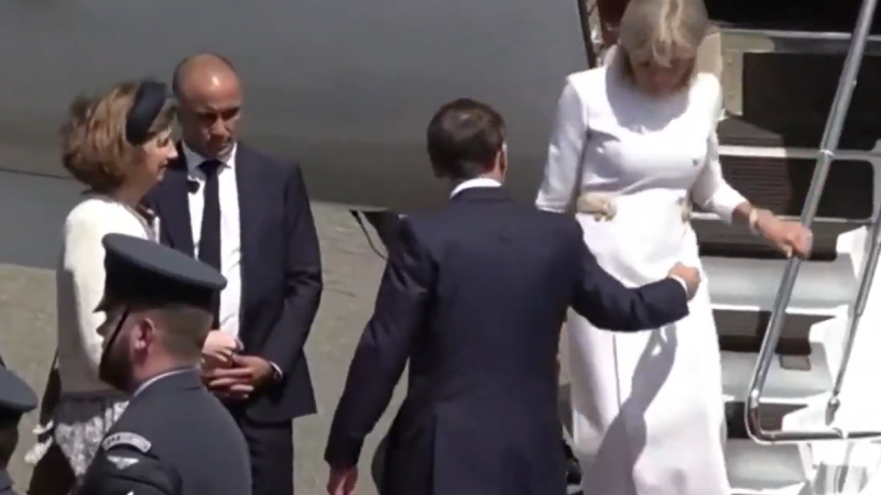 During their landing in London, Macron was down the plane's stairs waiting for his wife Brigitte, who was following him, but when he extended his hand to help her come down, she kept looking down and refused his help or touch the French President's hand.