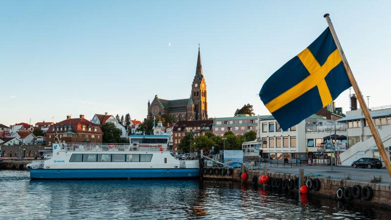 Lysekil, Sweden - July-12-2024, Ferry landing in the port with the church in the backgroundunder the moon in a midsummer night. A Sweden Flag waving in the foreground. (Shutterstock)