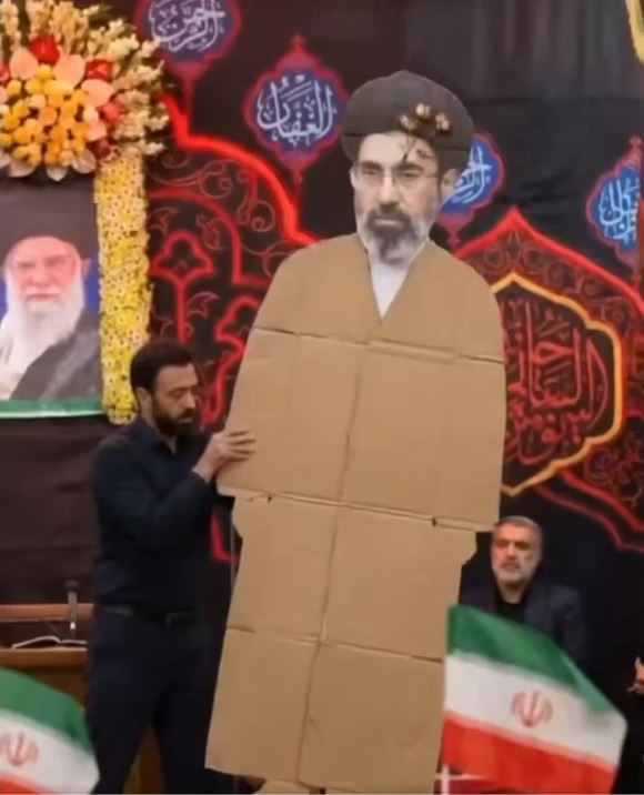 A cardboard cutout of Mojtaba Khamenei. (X)