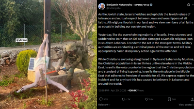 Netanyahu added, "Yesterday, like the overwhelming majority of Israelis, I was stunned and saddened to learn that an IDF soldier damaged a Catholic religious icon in southern Lebanon. I condemn the act in the strongest terms. Military authorities are conducting a criminal probe of the matter and will take appropriately harsh disciplinary action against the offender."