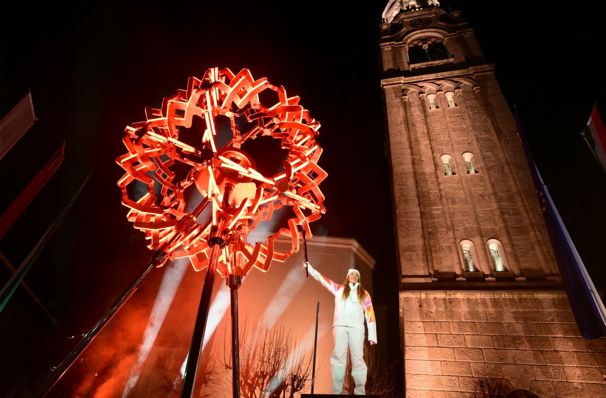 Final torchbearer Italian skier Sofia Goggia holds the torch of the Olympic flame next to the Olympic cauldron designed by Marco Balich during the opening ceremony of the Milano Cortina 2026 Winter Olympic Games. (Photo by Stefano RELLANDINI / POOL / AFP)